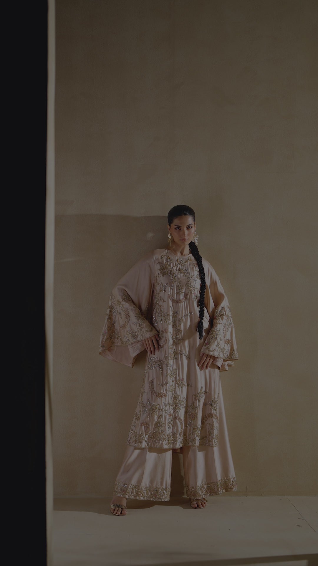 A butter silk long tunic paired with cropped wide-leg pants in a soft almond hue. Intricate bullion work with crystals and Matsuno beads creates a refined, versatile formal look.