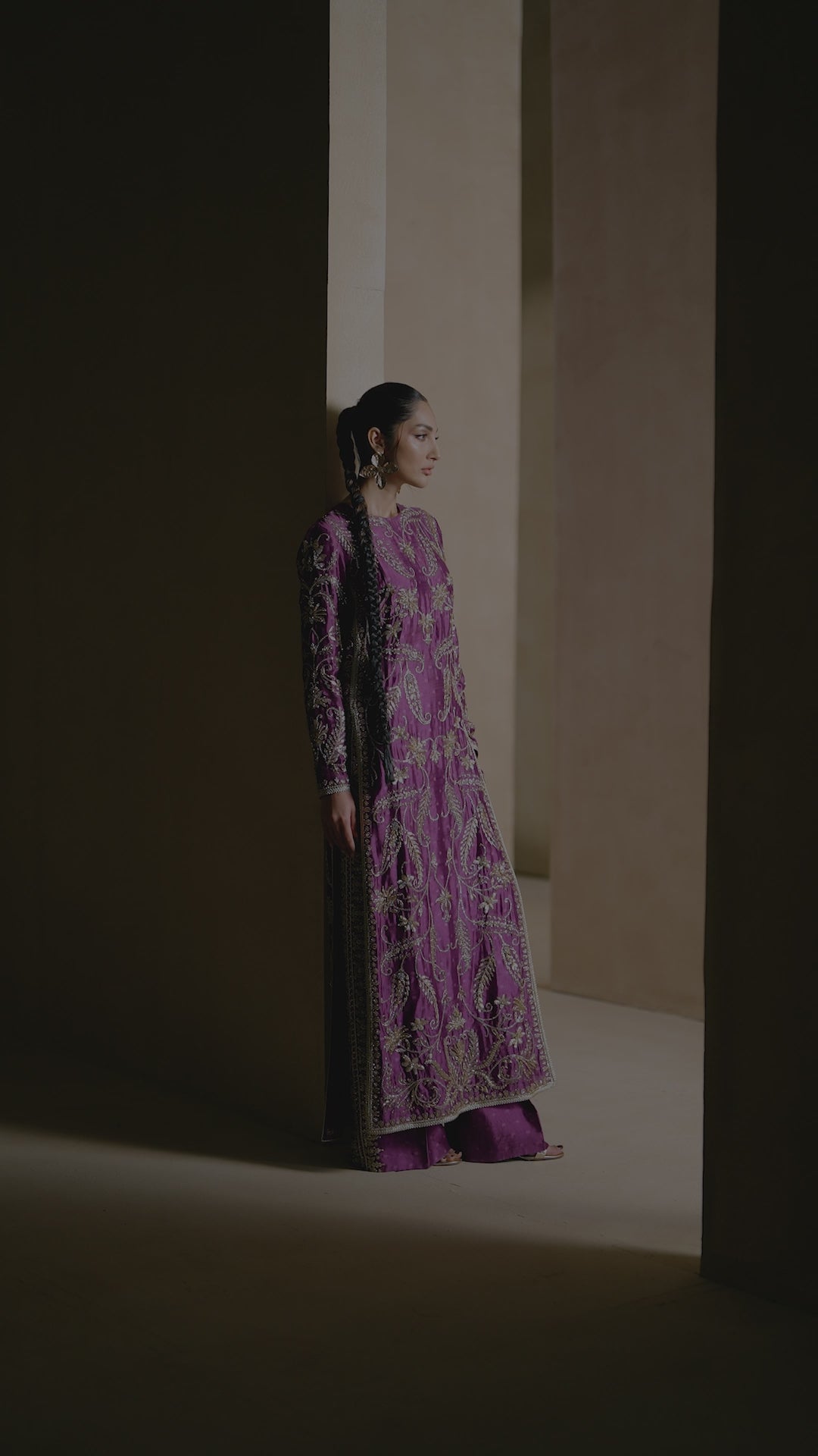 A butter zari silk long tunic with straight pants in a rich grape tone. Detailed with intricate gotta patti, bullion wirework, Swarovski stones, Matsuno beads, and subtle sequins.