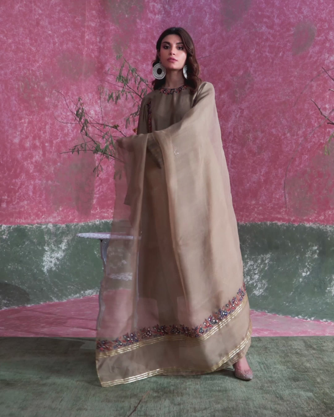 Dazzle in this Indian tan long tunic paired with straight pants in khadi silk. Detailed with intricate thread embroidery, gotta zardozi, matsuno beads, and delicate stones, it's ideal for evening events where you want to shine bright.