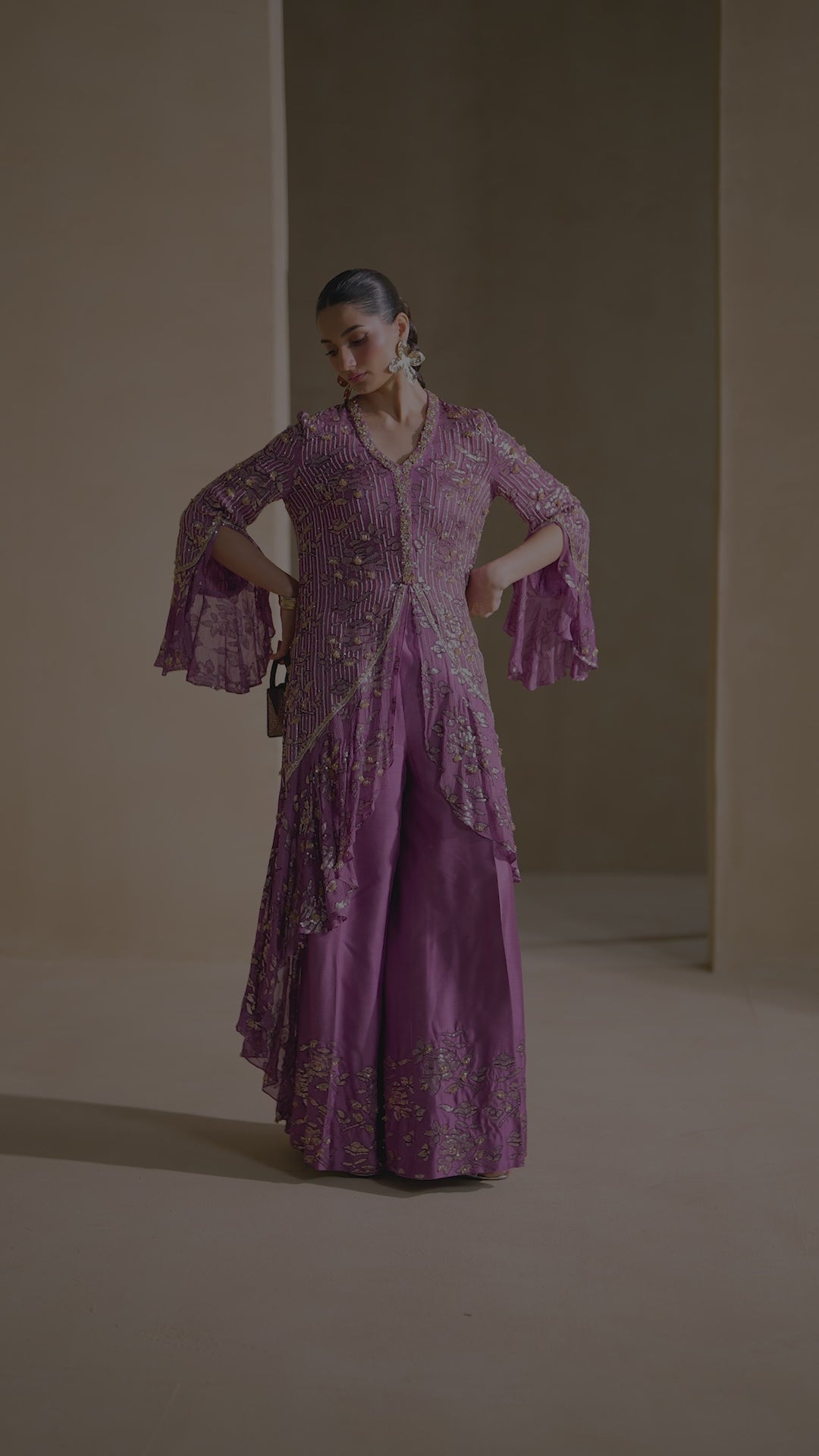 A silk chiffon maxi tunic paired with butter silk wide-leg pants. Embellished with Swarovski stones, crystals, and 3D floral motifs with thread and sequin detailing.