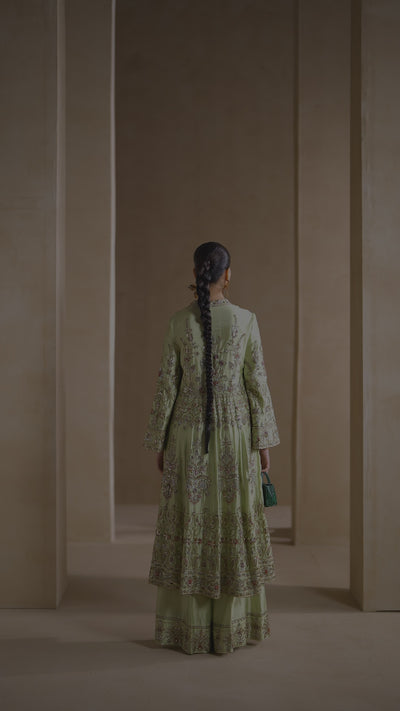 A front-open paneled butter silk tunic with wide-leg pants, delicately embellished with silk thread, bullion wire, gotta patti, and Swarovski stones. Elegant and festive with a modern silhouette.