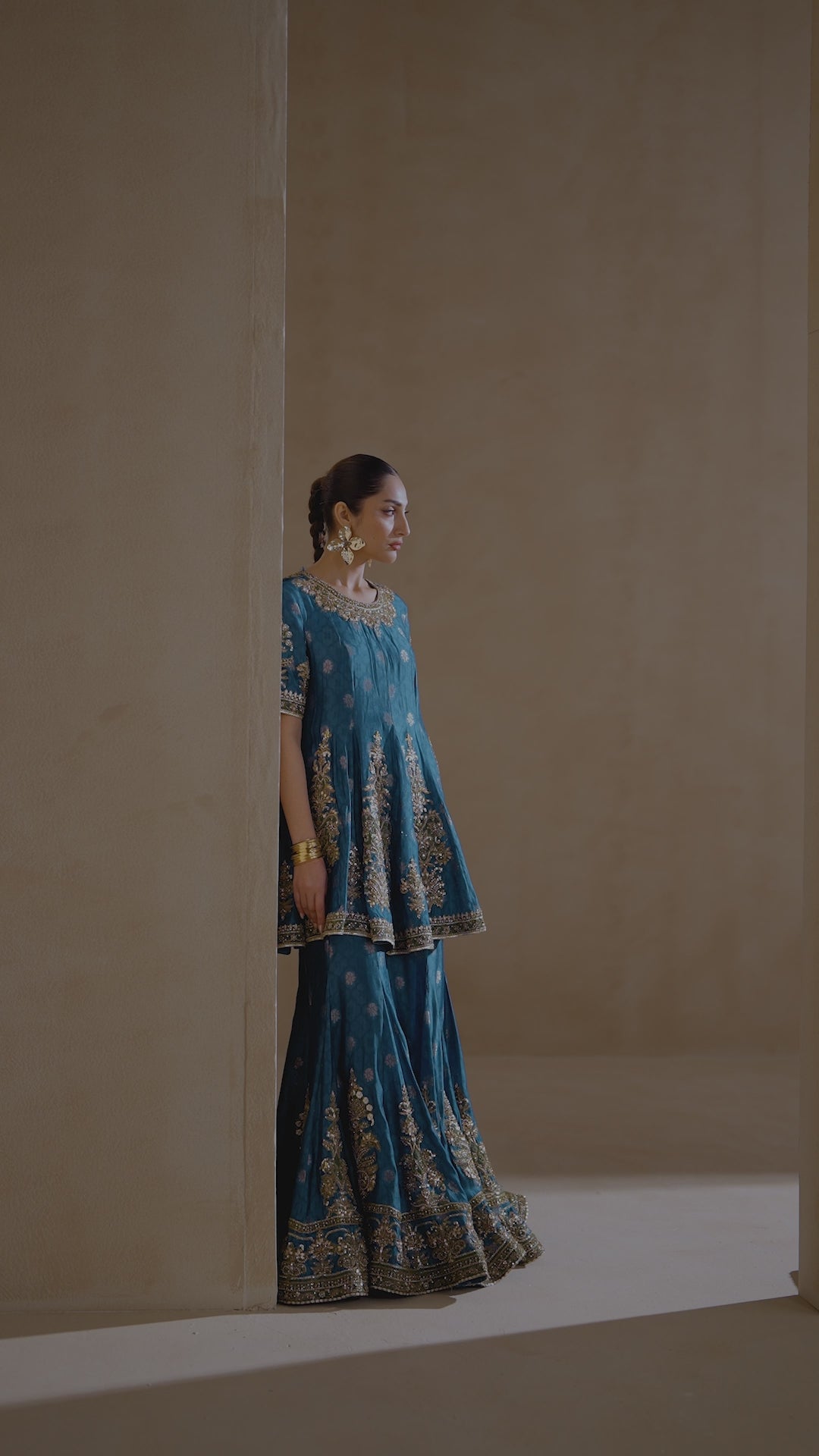A butter zari silk peplum top paired with flared godet pants. Finished with gotta patti, Swarovski stones, crystals, sequins, and bullion zardozi work for a statement formal look.