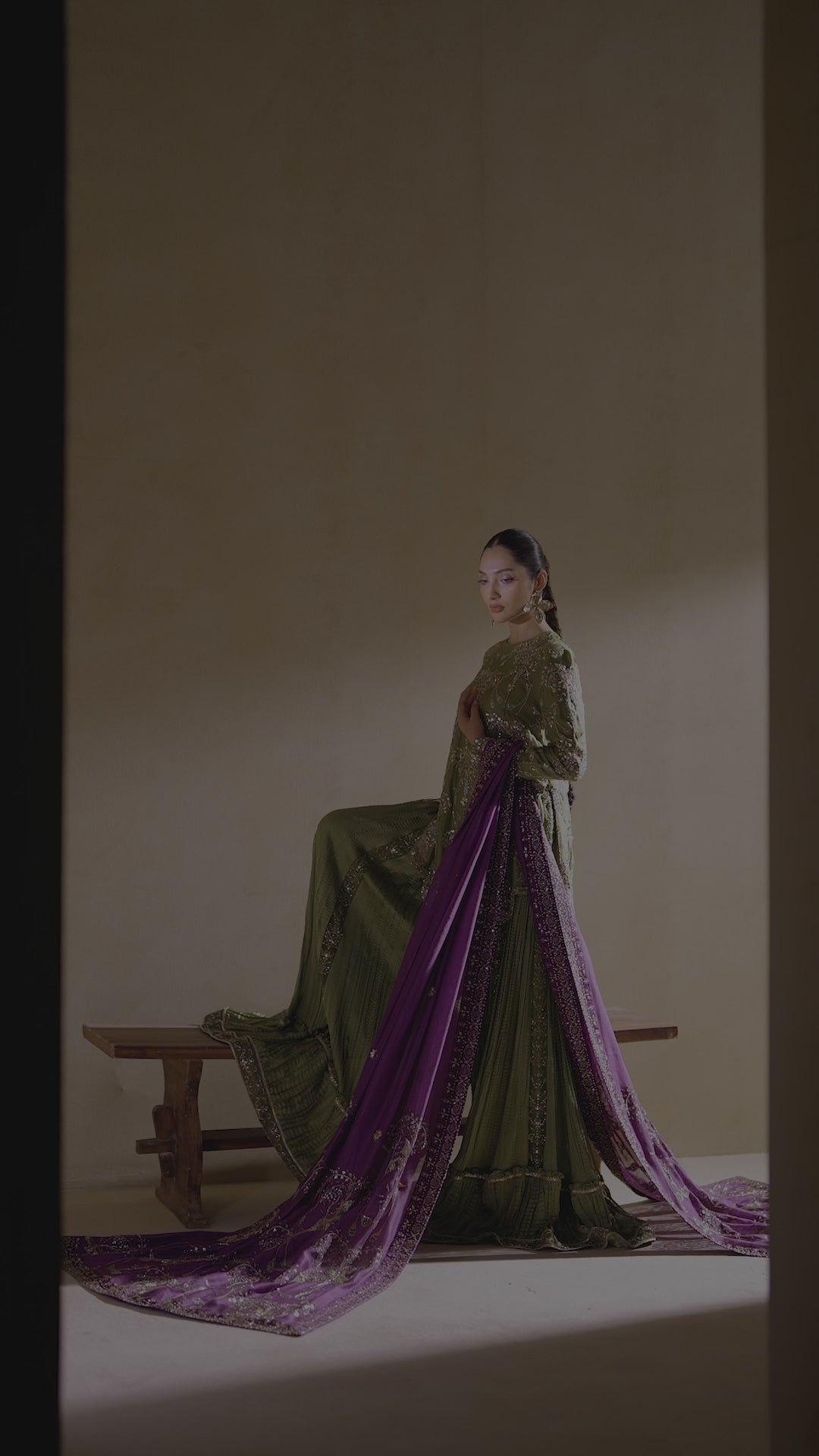 A peridot green tunic paired with crushed wide-leg pants and a contrast dupatta. Embellished with gotta work, bullion zardozi, sequins, and Matsuno beads.